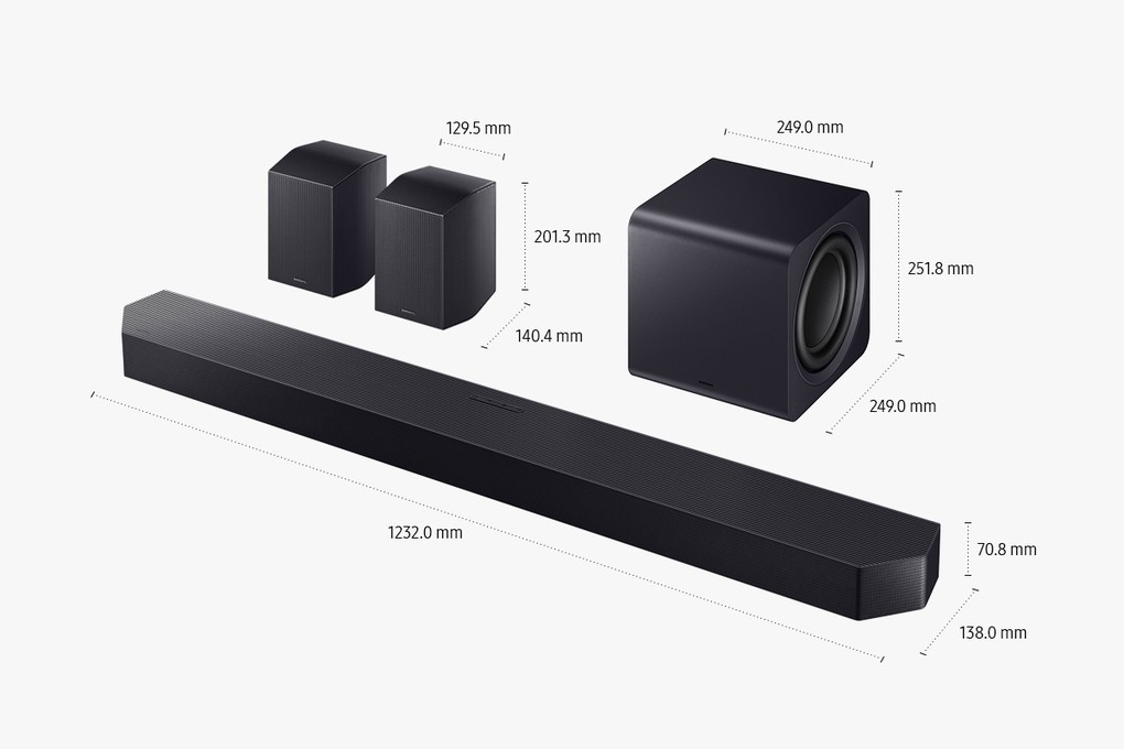 Kích thước loa thanh: Ngang 123.2 cm – Sâu 13.8 cm – Cao 7.08 cm – Nặng 7.3 kg