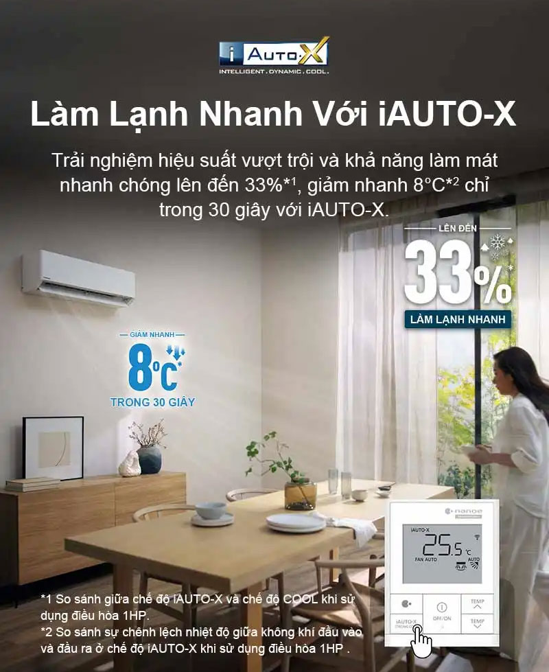 Công nghệ iAuto-X giúp tăng tốc quá trình làm lạnh ngay khi bật máy, mang lại cảm giác mát mẻ tức thì. Nhờ đó, bạn không cần phải chờ đợi lâu để tận hưởng không gian thoáng mát, đặc biệt trong những ngày hè oi bức.