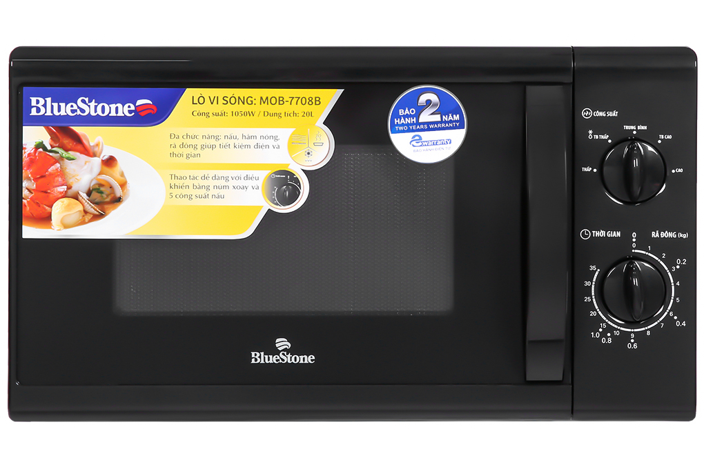 Lò vi sóng BlueStone MOB-7708B 20 lít của thương hiệu BlueStone – Singapore uy tín, công suất 1050W với 5 mức điều chỉnh làm chín thức ăn nhanh, điều khiển nút vặn tiếng Việt dễ hiểu, đa chức năng, kiểu dáng nhỏ gọn, phù hợp với gia đình ít thành viên.