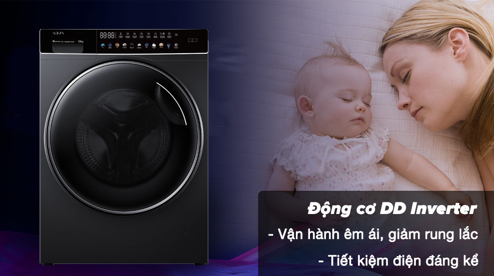 –Động cơ DD Inverter: Giúp cho máy giặt Aqua đạt hiệu quả giặt sạch tối ưu mà vẫn đảm bảo tiêu chívận hành êm ái, giảm thiểu tình trạng rung lắctrong suốt chu trình giặt vàtiết kiệm điện năngđáng kể.