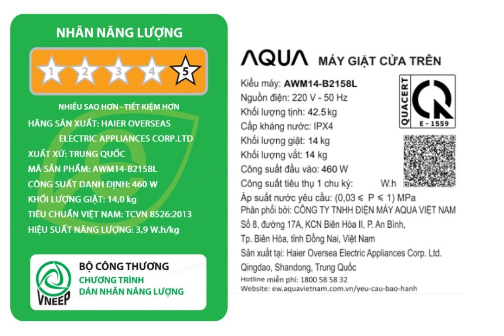 Thông số kỹ thuật Máy giặt Aqua Inverter 14 kg AWM14-B2158L(B)