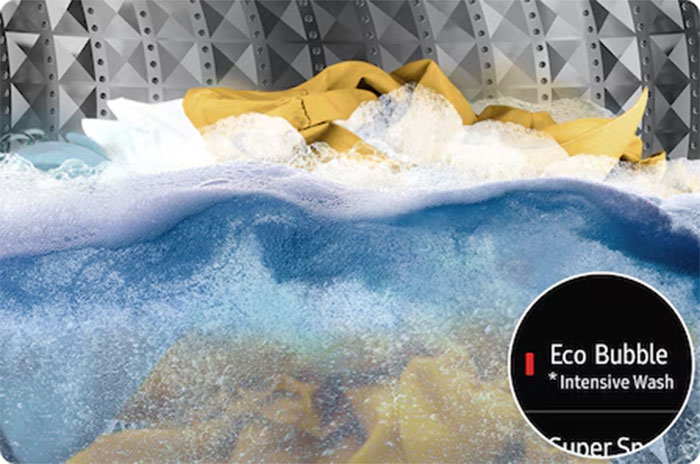 Công nghệ EcoBubble™ hòa tan bột giặt với nước và không khí, tạo thành bong bóng siêu mịn thẩm thấu nhanh vào sợi vải, giúp loại bỏ vết bẩn hiệu quả ngay cả trong nước lạnh. Quá trình này không chỉ tăng hiệu quả giặt sạch mà còn bảo vệ sợi vải, giữ cho quần áo bền màu và chất liệu tốt hơn.