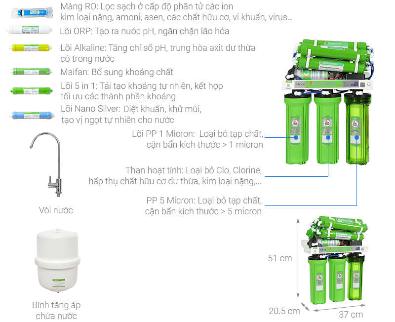 – Lõi số 8 – Lõi 5 in 1 lõi khoáng đặc biệt tạo ion âm bổ sung cho nước, giúp nước dễ hấp thụ hơn trong cơ thể.