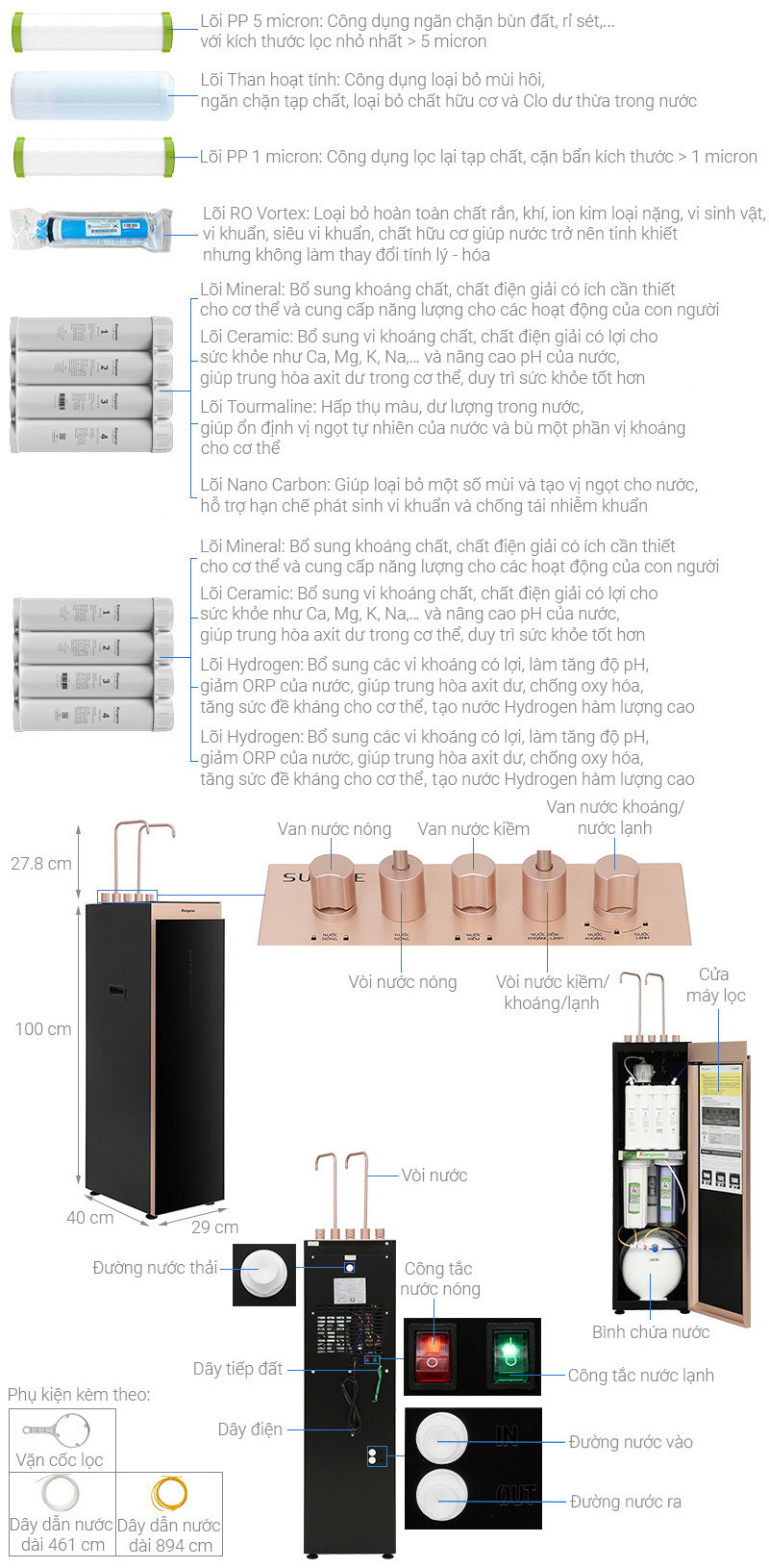 Số loại nước: 4 loại: nước ion kiềm Hydrogen, nước tinh khiết (nóng – nguội – lạnh)