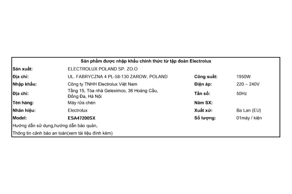 Thông số kỹ thuật Máy rửa bát độc lập Electrolux ESA47200SX