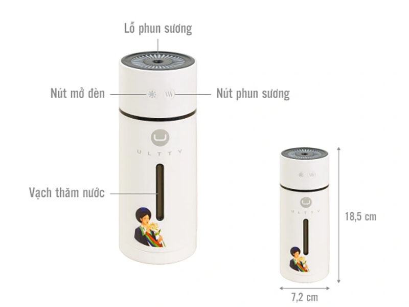 Ultty B23 có chức năng có chức năng tạo độ ẩm phòng, làm đèn ngủ. Máy sử dụng pin sạc với dung lượng pin lớn 1.000 mah giúp tạo ẩm ở bất kì đâu mà không cần dây điện. Máy sạc pin qua cáp sạc USB type-C.