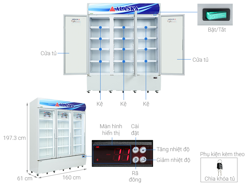 – Bên trong tủ mát Alaska có 3 ngăn chứa đồ tương ứng mỗi ngăn có 1 cánh cửa để sử dụng độc lập, trong mỗi ngăn lớn có 4 kệ chia làm 5 ngăn nhỏ để bạn dễ dàng phân loại và trưng bày thực phẩm ngăn nắp.
